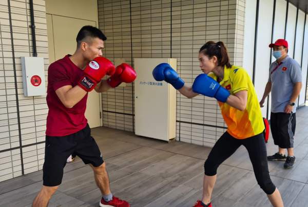 Tương tự, HLV Nguyễn Như Cường và Đinh Thị Phương Thanh cùng 2 võ sĩ Nguyễn Văn Đương và Nguyễn Thị Tâm xuống ngay sảnh dưới của toà nhà để tập luyện. Đội tuyển boxing có buổi tập đầu tiên do BTC Thế vận hội sắp xếp vào 17h hôm nay.