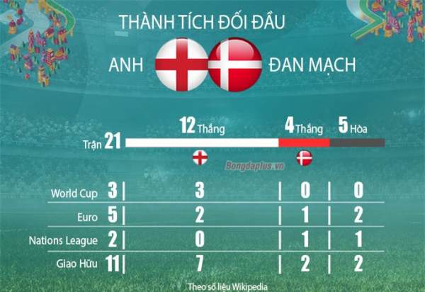 Trước khi hai đội đại chiến với nhau trên sân Wembley giữa tuần tới, Anh vs Đan Mạch từng có 26 lần đối đầu trong quá khứ. Lịch sử đang gọi tên ĐT Anh, những người đã có 14 chiến thắng, gấp đôi số trận thắng của Đan Mạch (7 trận) và hai đội bất phân thắng bại trong 5 trận đấu.