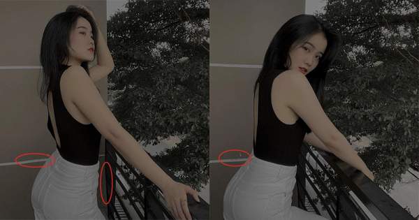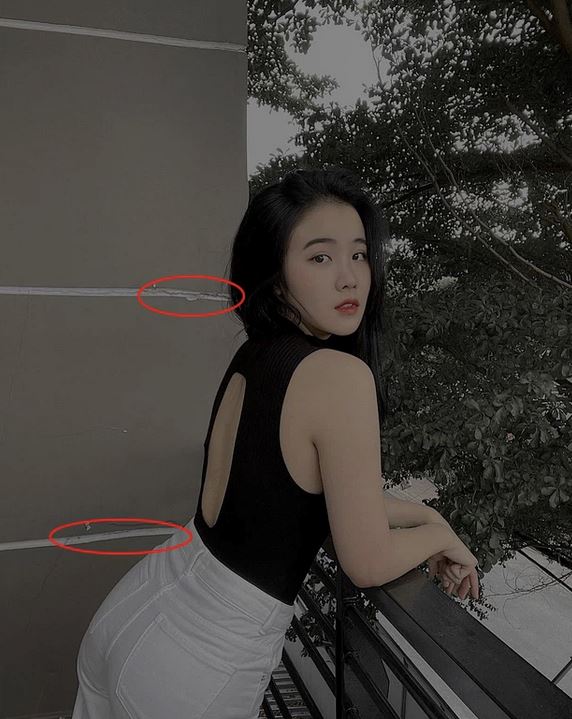 Theo đó, nhiều người để ý bức tường làm nền cho Hoàng Anh Ốc trong các bức ảnh, dường như chúng đã bị bóp méo, co kéo để vòng eo của chính chủ trông đẹp hơn, thon gọn hơn. Để chắc chắn hơn cho nhận định này, khi đối chiếu 2 bức ảnh ở cùng 1 góc chụp, sẽ thấy đường kẻ trên tường đang méo lại bất ngờ thẳng tắp...