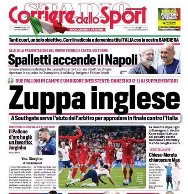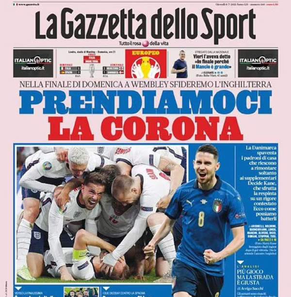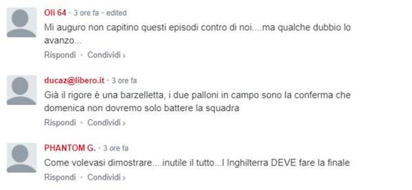 Tờ Corriere dello Sport không nói nhiều về tính chất của quả penalty nhưng phần bình luận của độc giả đầy rẫy những lời fan Italia bày tỏ sự hoài nghi về khả năng nó tái diễn ở chung kết. “Tôi hy vọng trường hợp này không xảy ra với chúng ta, nhưng tôi nghi lắm”, “quả penalty đó đã là một trò đùa, lại xảy ra khi có những 2 quả bóng trên sân chứng tỏ ở chung kết chúng ta sẽ không chỉ phải đánh bại mỗi đội Anh”, là những bình luận trong bài viết về trận đấu.