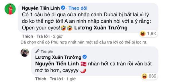 Tiến Linh viết: "Có 1 cậu bé đi qua cửa nhập cảnh Dubai bị bắt lại vì lý do không thể ngờ tới! Anh an ninh nhập cảnh nói với anh ý rằng: Open your eyes! (Tạm dịch: Mở mắt ra!)". Cứ tưởng chuyện đùa, ai ngờ Lương Xuân Trường đã để lại bình luận xác nhận mình đã cố gắng hết sức: "Nhăn hết cả trán rồi vẫn bắt mở to hơn, cayyyy".