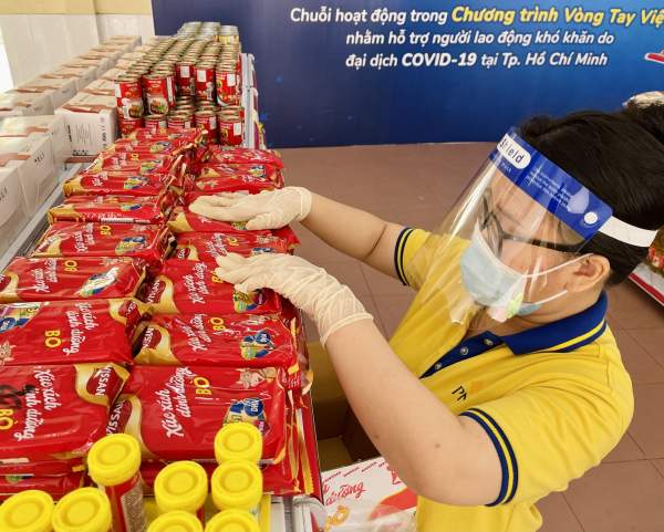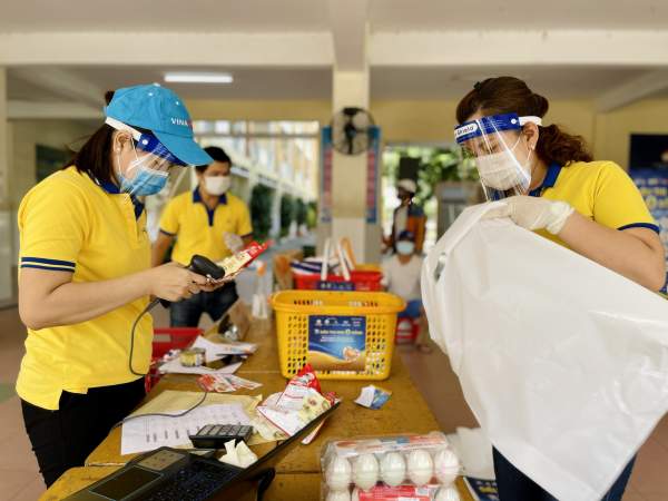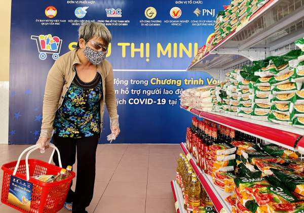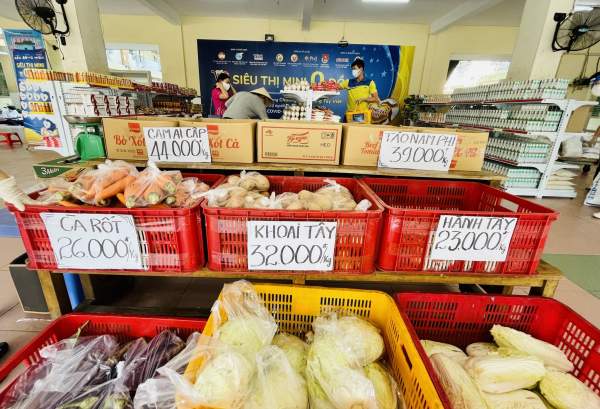 Siêu thị mini 0 đồng lần thứ 21 này được đặt trong khuôn viên một trường học ở Q.Tân Phú, TP.HCM. Quanh đó, các chợ truyền thống gần như đều đóng cửa, dây giăng phong tỏa khắp nơi.