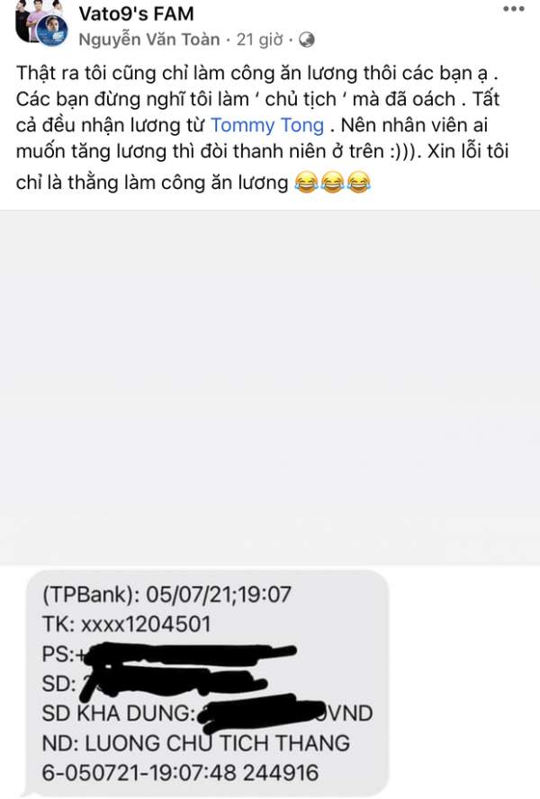 Ấy thế mà mới đây, Văn Toàn lại lên mạng "bán than", giải thích chuyện "chủ tịch" nhưng không hề oách mà cũng chỉ làm công ăn lương. Cụ thể, chàng cầu thủ CLB HAGL đã đăng ảnh nhận được chuyển khoản với nội dung "Lương chủ tịch tháng 6" và chia sẻ trong group fan của mình: