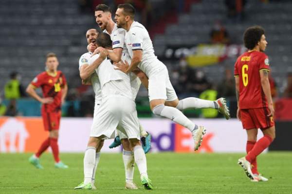 Đến trận tứ kết thứ 2 diễn ra tại sân Allianz Arena (Munich, Đức) cũng trong tối 2/7, ĐT Italia thay vì được mặc màu áo thiên thanh truyền thống đã phải mặc áo trắng, trong khi ĐT Bỉ mặc áo đỏ truyền thống. Dẫu vậy, đoàn quân của HLV Roberto Mancini vẫn chơi tấn công vũ bão và có 2 bàn thắng liên tiếp dẫn trước đội bóng số 1 thế giới nhờ công của tiền vệ trung tâm Nicolo Barella và tiền đạo Lorenzo Insigne.