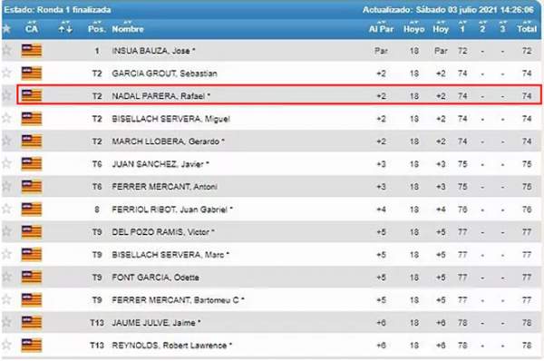 Đáng chú ý, theo nhật báo Marca (Tây Ban Nha), Rafael Nadal vừa giành chức á quân giải golf vô địch quần đảo Balearic năm nay khi anh có tổng thành tích 74 gậy như Sebastian Garcia Grout, khi chỉ nhiều hơn nhà vô địch Jose Insua Bauza 2 gậy.