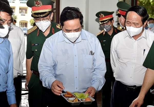 Trước tình hình dịch bệnh Covid-19 bùng phát tại nhiều địa phương, trong đó có Bắc Ninh và Bắc Giang, người đứng đầu Chính phủ đã trực tiếp xuống "tâm dịch" để chỉ đạo và động viên cán bộ, nhân dân. Ngày 29/5, ông tới thăm bệnh viện dã chiến số 2 đóng tại Trung đoàn 831. bệnh viện có 130 y - bác sĩ của Học viện Quân y 103 và lực lượng cán bộ Trung tâm nhiệt đới Việt - Nga về hỗ trợ cho tỉnh Bắc Giang lấy mẫu xét nghiệm. Thủ tướng kiểm tra khu vực bếp ăn, khẩu phần ăn của cán bộ, chiến sĩ và lực lượng làm nhiệm vụ tại đây. Ảnh: Nhật Bắc/VGP.