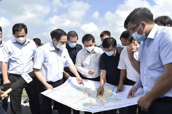 Thủ tướng Phạm Minh Chính cũng là người rất quan tâm đến đầu tư hạ tầng, ông coi đó là một trong những đột phá chiến lược quan trọng. Ông mong muốn các bộ ngành, địa phương thu hút nguồn lực trong xã hội, đẩy mạnh phát triển hạ tầng. Với vốn đầu tư công thì phải làm những dự án trọng tâm, trọng điểm, "có tấm, có món". Sau khi tiếp xúc cử tri tại TP Cần Thơ, Thủ tướng tới thị sát tiến độ một dự án cao tốc thành phần, thuộc cao tốc Bắc - Nam vào ngày 9/5. Trong ảnh có Phó thủ tướng Lê Văn Thành, Bộ trưởng GTVT Nguyễn Văn Thể, Bí thư Thành ủy Cần Thơ Lê Quang Mạnh. Ảnh: Nhật Bắc/VGP.