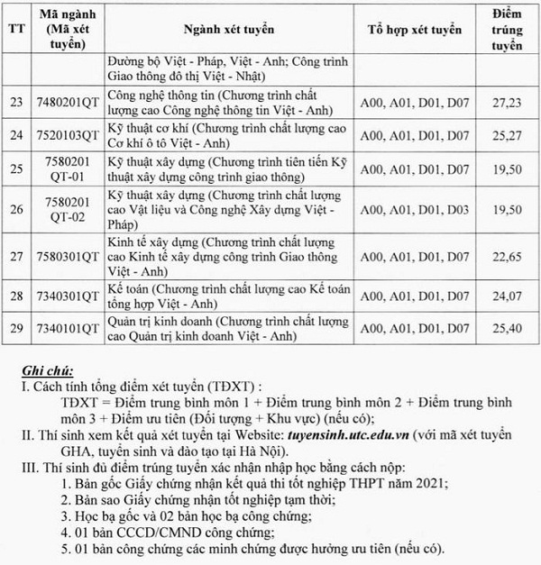 Điểm chuẩn Đại học Giao thông vận tải theo hình thức xét học bạ năm 2021.