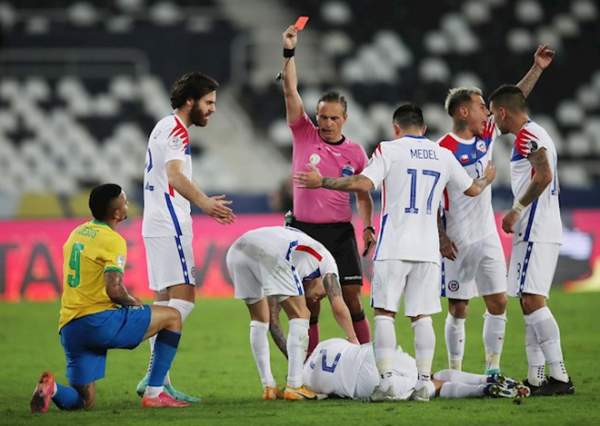 Có được bàn thắng mở tỷ số trước, tưởng như Brazil sẽ tạo ra thế trận tốt hơn thì phút 49, tiền đạo Gabriel Jesus trong một pha tranh chấp bóng ở giữa sân lại tung cước đạp thẳng vào mặt của Mena và ngay lập tức nhận thẻ đỏ từ trọng tài rời sân.