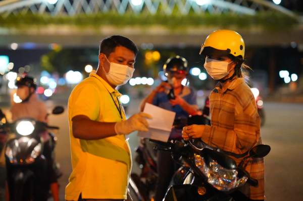 Phó chủ tịch UBND P.9 kiểm tra giấy tờ xác nhận đi lại của người lưu thông trên đường