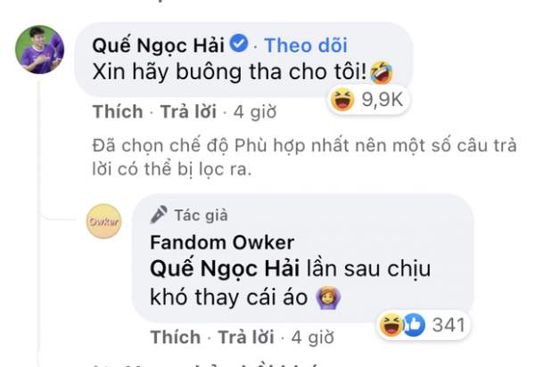 Bên dưới phần bình luận của Fanpage này, Quế Ngọc Hải chỉ biết vào khóc ròng, buông nhẹ một câu bình luận đầy sự bế tắc: Xin hãy buông tha cho tôi! Còn riêng fan của anh chàng thì chỉ nhẹ nhàng nhắc nhở thân thiện rằng lần sau chịu khó... thay cái áo tí cho đỡ bị "bóc".