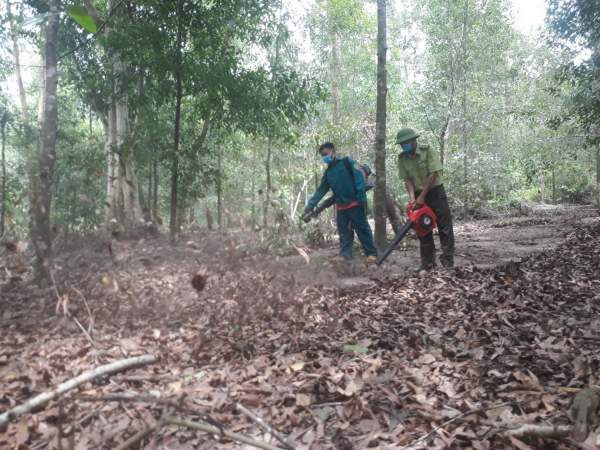 Kiểm lâm và người dân dùng máy thổi phát quang các thảm thực vật khô nỏ và tạo đường băng cản lửa.