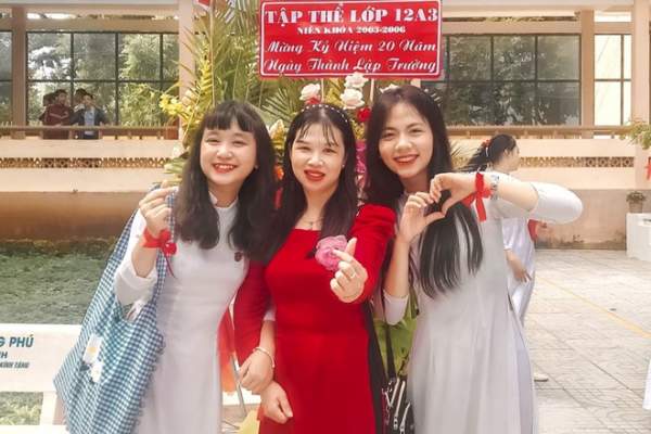 Minh Huê cùng bạn bên cạnh cô giáo dạy Văn Tạ Thị Ngọc Lam (Ảnh: NVCC).