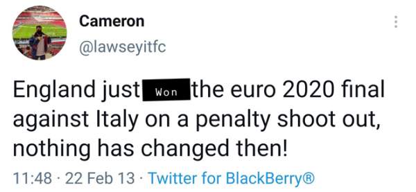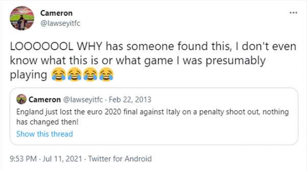 Trong ngày kết thúc EURO 2020, cộng đồng mạng lại "khai quật" được thêm một "nhà tiên tri" nữa khiến người ta phải ngỡ ngàng. Một tài khoản cá nhân trên mạng xã hội có tên Cameron (@Lawseyitfc) đã đăng một bài viết từ ngày 22/2/2013 tức là cách đây hơn 8 năm với nội dung sau: