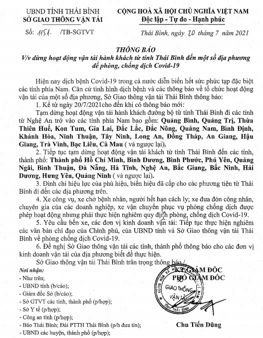 Ngày 20/7/2021, Sở Giao thông Vận tải tỉnh Thái Bình ra Thông báo số 1151/TB-SGTVT về việc dừng hoạt động vận tải hành khách từ tỉnh Thái Bình đến một số địa phương để phòng, chống dịch Covid-19.