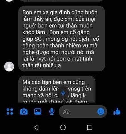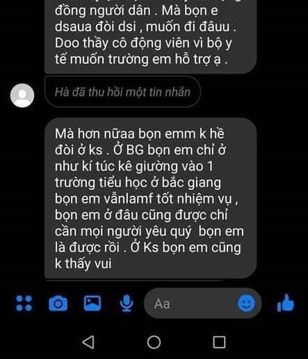 Hình ảnh một tin nhắn của một em tên Hà, tự xưng là sinh viên Hải Dương cũng được mạng xã hội chia sẻ mạnh bởi em tâm sự với thầy của mình: "Em đọc bài viết rồi, từng comment của mọi người mà nước mắt rưng rưng. Bọn em không hề đòi ở khách sạn, ở Bắc Giang tụi em ở ký túc xá, kê giường trong trường tiểu học. Bọn em ở đâu cũng được chỉ mong mọi người yêu quý bọn em". Người viết tin rằng đó chính là hình ảnh thật mà không phải ngụy tạo để tung tin fake. Bởi Việt Nam cả hơn một năm dịch Covid-19, bao lớp thanh niên, bao lớp bạn trẻ vẫn không hề ngại khó, ngại khổ, nguy nan để "giúp được chút sức lực nhỏ nhoi của mình".