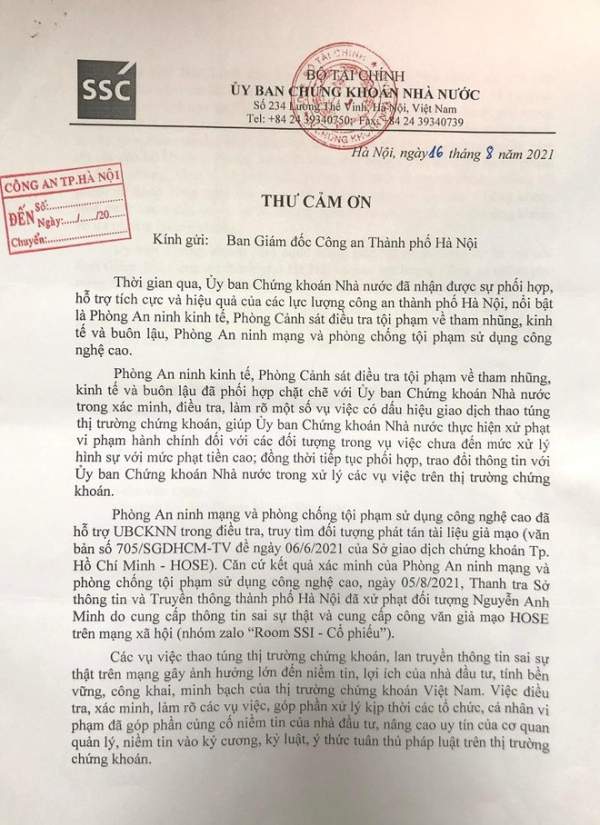 Thư cảm ơn của Uỷ Ban Chứng khoán Nhà nước gửi Công an Hà Nội