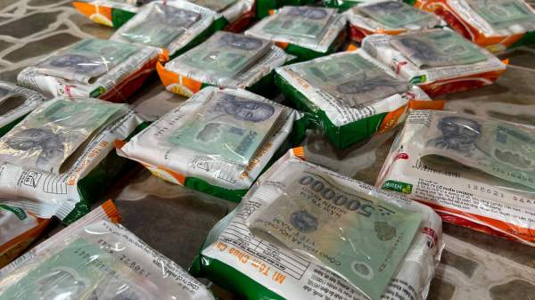 Những tờ tiền được anh Minh bọc cẩn thận trong ổ bánh và gói mì tôm. (Ảnh chụp từ clip)