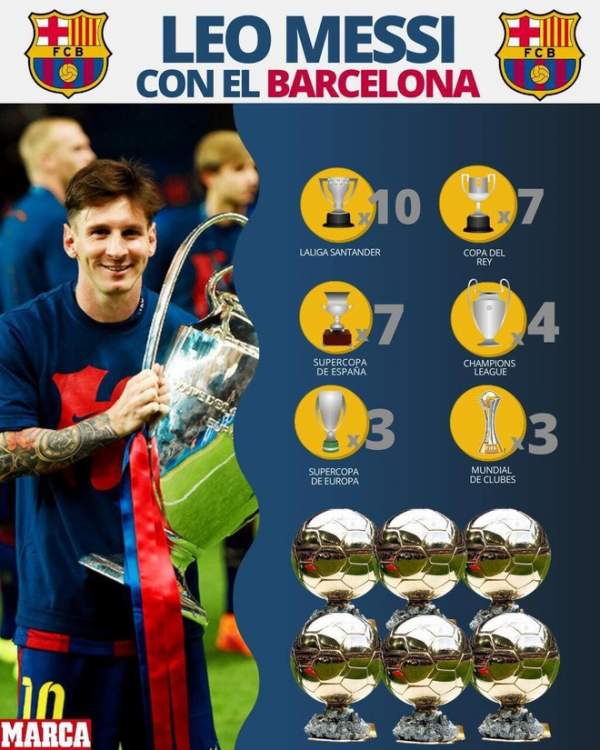 Messi chia tay Barcelona sau 778 trận đấu. Anh ghi 672 bàn, giành 10 danh hiệu La Liga, 4 Champions League, 7 Copa del Rey, 8 Siêu cúp Tây Ban Nha, 3 Siêu cúp châu Âu và 3 FIFA Club World Cup. El Pulga cũng có được 6 danh hiệu Quả bóng vàng.