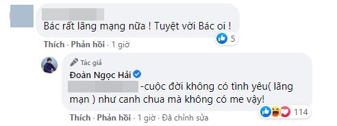 Đương nhiên, những người yêu mến ông Đoàn Ngọc Hải không bỏ qua cơ hội này để chòng ghẹo ông. Chẳng mấy khi người đàn ông nổi tiếng này hé lộ về chuyện riêng tư, nên những bình luận suy diễn tận đẩu đâu đã được viết ra. Ông Hải không thấy thế là phiền, thậm chí còn trả lời lại một bình luận có vẻ nhẹ nhàng nhất. Ông ví von, cuộc đời mà không có tình yêu cũng như canh chua mà không có me vậy, ý là chẳng có hương vị gì.