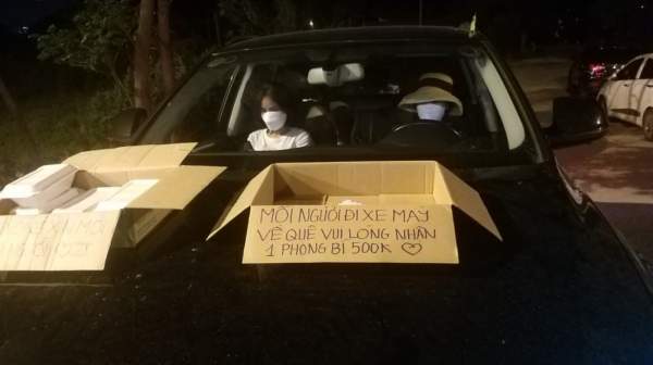 Trên trang cá nhân, chị T.H. viết: "Nhờ bạn bè thông báo cho những người về quê bằng xe máy để tránh dịch, đi qua cầu Bến Thủy 2 để mình chia sẻ một chút khó khăn với bà con. Gia đình mình đứng chờ ở đây đến 12 giờ đêm nay". Được biết trong mỗi chiếc phong bì ấy là 500 ngàn đồng.