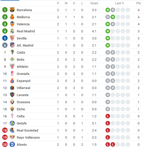 Bảng xếp hạng La Liga 2021/22 mới nhất