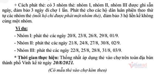 UBND các phường, xã in ấn thẻ vào chợ theo mẫu, gửi đến các khối, xóm phát cho tất cả các hộ gia đình, học sinh, sinh viên, người lao động tại địa bàn. Thời gian bắt đầu thực hiện kể từ ngày 20/8/2021.